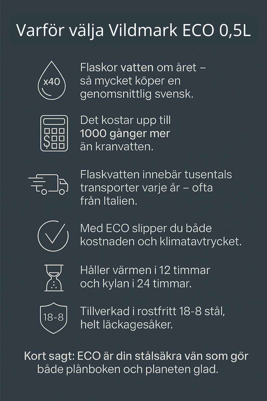 Fyller du Vildmark ECO flaskan med kommunalt dricksvatten betalar du ca 0,035 kr för en halvliter.